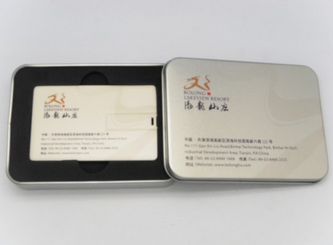 芯片翻转名片U盘 ,这是天津市滨海高新区滨海科技园的渤龙山庄专门定制的。名片印上了特有的团,用铁盒包装,在铁盒上也印上了他们特有的logo和图案。这款U盘,使用简单。而且,包装简单大方,又不失美观。这样的U盘,不管是